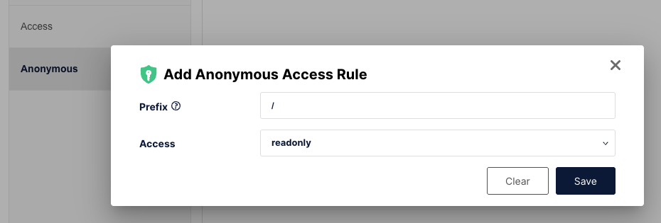 3. Click on the bucket then Anonymous, Add Access Rule and fill in the following details.